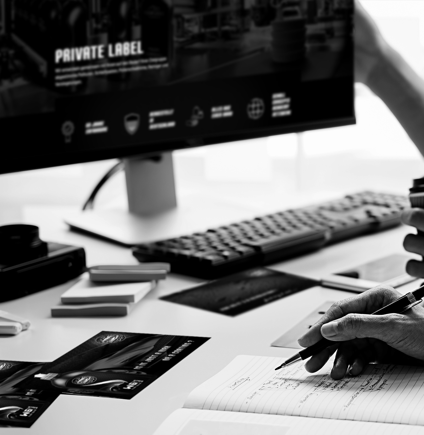 Au départ, nous avons des questions, rien que des questions : Nous commençons par des entretiens pour découvrir vos besoins réels. Vient ensuite la consultation conceptuelle par notre agence de marketing interne, actuellement composée de 7 personnes créatives : Nous déterminons les marchés cibles (par exemple, les utilisateurs finaux ou les carrossiers), analysons la concurrence et déterminons les prix et les canaux de vente. L'objectif est de développer votre gamme de produits de polissage ou d'entretien automobile de manière personnalisée et sur mesure, en tenant compte de vos exigences en matière de coûts cibles. Dans notre département R&D, nos chimistes et ingénieurs d'application transforment les idées en réalité. Des tests de produits continus avec des systèmes de polissage entièrement automatisés et des ateliers de carrosserie spécifiquement sélectionnés nous donnent un retour d'information objectif sur la qualité et garantissent votre succès durable sur le marché.
