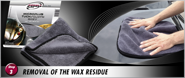 Essuyez la plus grande partie du film avec le chiffon gris pelucheux MicroPLUS. Il n'est pas forcément nécessaire d'éliminer complètement les résidus de cire.